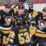 As Pesce leaned down to impede the rush, Tomasino dished a pass from the right circle to Heinen, dashing in from the left wing. Stopping the puck with his right skate, Heinen tapped in a backhander by an ill-positioned Markstrom. Tomasino and defenseman Vladislav Kolyachonok collected assists. It was Kolyachonok’s first point as a member of the Penguins since joining the club through waivers Feb. 9.