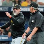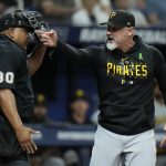 Pittsburgh Pirates manager Derek Shelton, left, is held back by umpire Manny Gonzalez as he points at home plate umpire Quinn Wolcott after being ejected during the fourth inning of a baseball game against the Tampa Bay Rays Wednesday, May 3, 2023, in St. Petersburg, Fla.