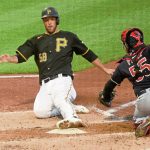 Pirates catcher Jacob Stallings beats the tag by the Indians’ Roberto Perez in the sixth inning during an exhibition game Saturday, July 18, 2020 at PNC Park.