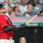 The Cleveland Indians’ Roberto Perez watches his three-run home run in the eighth inning against the Kansas City Royals on July 8, 2021, in Cleveland.