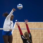 Pitt’s Lexis Akeo (1) moves to hit ball over the net during their game against Cincinnati in the NCAA tournament at the University of Pittsburgh’s Petersen Events Center on Saturday, Dec. 7, 2019.