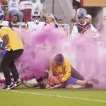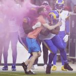 The Rams linebacker flattened the protester who ran on the field with a device emitting pink smoke late in the second quarter of Los Angeles’ game against the San Francisco 49ers on Monday night.