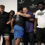 Members of the team, including several offensive linemen, along with his agent, family members and team owner Mark Davis gave him a round of applause as he entered the room.