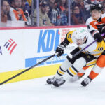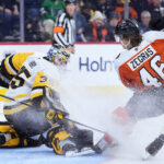Claiming a rebound off his own right half wall, Penguins defenseman Ryan Shea initiated a rush out of his own zone and fed a centering pass to forward Anthony Mantha. Gaining the offensive zone at the center point, Mantha offloaded the puck to the right wing for Rust, who marched into the top of the near circle and snapped off a wrister to the far side. Goaltender Dan Vladar, at the top of his crease, scrunched his body up to make the save but allowed a rebound to trickle loose to the left of the blue paint. Crosby crashed in, fended off Flyers defenseman Emil Andrae and chopped the loose puck over Vladar’s right leg. Rust and Mantha had assists.