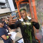 Pittsburgh Steelers wide receiver JuJu Smith-Schuster talks on social media after getting slimed at the Nickelodeon booth during the Steelers Family Fest during an NFL football practice on Sunday, Aug. 19, 2018, at Heinz Field in Pittsburgh.