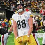 Steelers tight end Pat Freiermuth celebrates after a long reception against the Atlanta Falcons during the first half Sunday, Dec. 4, 2022, in Atlanta.