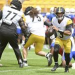 • The Steelers offense worked “seven shots” into the end zone on the Ohio River side of the stadium. Wilson took the first four snaps, tripping after taking the first snap but finding George Pickens in the back of the end zone on the second and Dez Fitzpatrick wide open behind the defense on a quick toss for the third snap. Jaylen Warren was stopped for a loss on a run to the left side on the fourth and final snap for the first-teamers.