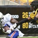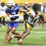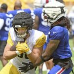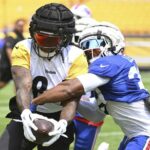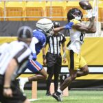 During a 7-on-7 period late in Thursday’s joint practice at Acrisure Stadium, Pat Freiermuth reeled in a pretty one-handed catch while running full stride toward the back-right corner of the end zone while Christian Benford was in tight pursuit.