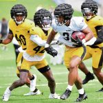 Pickens’ first touchdown in a seven-on-seven red-zone drill showed deft route-running when he found a soft spot between veteran first-team defenders Cameron Sutton, Minkah Fitzpatrick and Terrell Edmunds on a post route. Pickens leaped to catch the ball over the goal line and landed in the end zone.