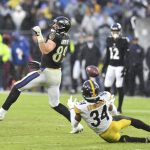 Steelers safety Terrell Edmunds defends on a pass intended for the Ravens’ Mark Andrews in overtime on Sunday, Jan. 9, 2022 at M&T Bank Stadium.
