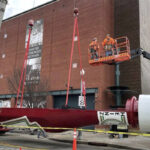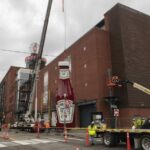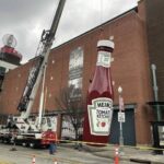 The installation, which will be a day-long project, began at 7 a.m. when the ketchup bottle arrived. The bottle weighs 7,000 pounds and the base is 9.5 feet wide. Approximately 13,000 gallons of Heinz ketchup would fit inside this bottle, according to the History Center. Once the bottle is mounted on the steel pedestal, it will stand at more than 55 feet tall.