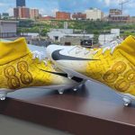 He said he’s been doing art since his childhood. He is self-taught, and he used it as a way to relax. He uses leather paint if the cleats are leather and mixes an adhesive agent with other paint so it stays.