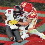 Tampa Bay Buccaneers’ Antonio Brown makes a touchdown reception against Kansas City Chiefs’ Tyrann Mathieu during the first half of the NFL Super Bowl 55 football game Sunday, in Tampa, Fla.
