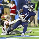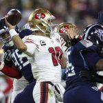 Garoppolo threw for 322 yards and moved the 49ers down the field at ease early, setting up Jeff Wilson’s 1-yard plunge on the opening drive and giving them goal-to-go on the second possession. Titans cornerback Jackrabbit Jenkins beat 49ers tight end George Kittle for an interception in the end zone.
