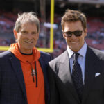 Former NFL players Bernie Kosar, left, and Tom Brady, right, pose for a photo as they talk on the field during warmups before a football game between the Dallas Cowboys and the Cleveland Browns in Cleveland, Sunday, Sept. 8, 2024.