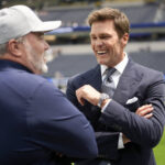 Dallas Cowboys head coach Mike McCarthy speaks with Tom Brady, right, during the first half of a preseason NFL football game against the Los Angeles Rams, Sunday, Aug. 11, 2024, in Inglewood, Calif.