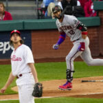 Ketel Marte stretched his postseason hitting streak to 15 games with a run-scoring triple in the fifth that built a 4-1 lead and chased Nola. He added an RBI single in the seventh off Orion Kerkering.