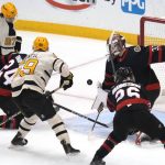 A mere 103 seconds later, the visitors responded when forward Brady Tkachuk scored his 17th goal through slightly bizarre circumstances. Gaining the Penguins’ zone on the right wing via a two-on-two rush with Tkachuk, Senators forward Tim Stutzle lifted a wrister from the right circle that Jarry rejected. As the rebound bounced to the left of the cage and was settled by Tkachuk, Penguins forward Sidney Crosby and defenseman Marcus Pettersson each crashed into the net. With Jarry cut off by his teammates, Tkachuk, who lost his glove while skating up ice, banked a wrister off of Pettersson’s right leg and into the cage. The lone assist went to Stutzle.